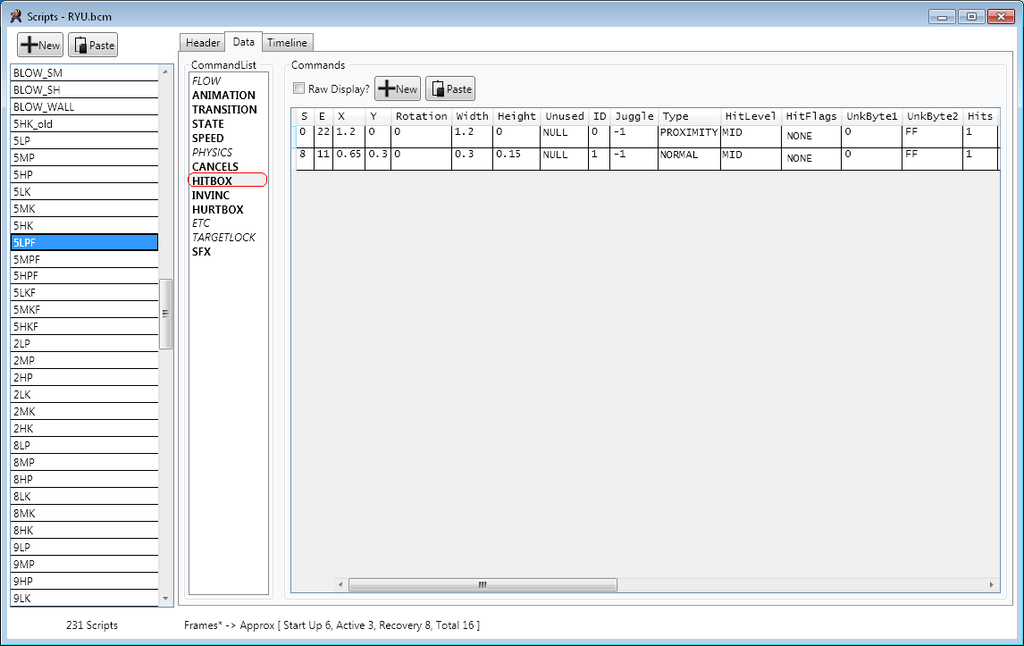 Hit boxes are the basis of how two characters interact in fighting games. Hit box data can be found in the Scripts section of Ono Tool. When you select a move from the left frame of the Scripts window you will find one of the sections listed is Hit box.