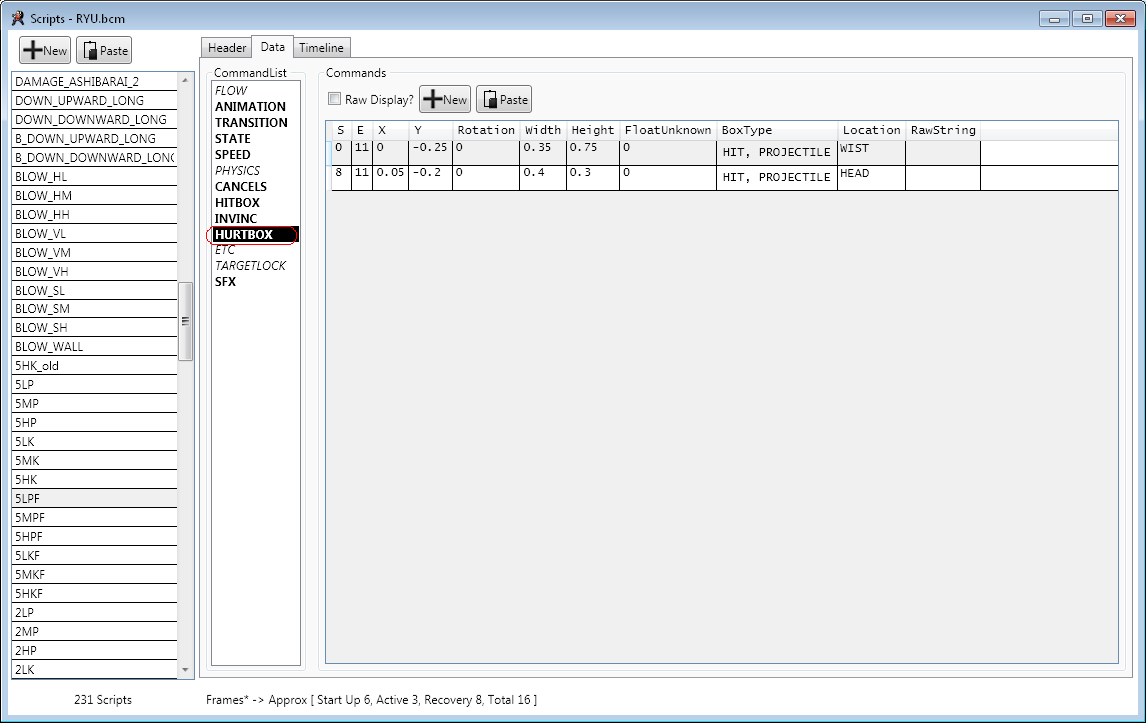 By default there are exactly 20 Strike/Projectile hurtboxes, 3 throw hurtboxes, and 3 Push boxes on each character. Unlike hitboxes it is not possible to actually create a hurtbox, instead the only thing that can be done is take an existing hurtbox and modify it. The first option is you can disable specific hurtboxes from being vulnerable to specific attack types by using invincibility. After that hurtboxes can be manually modified within the hurtbox section. Either changing their location relative to the original body part they came from, or by modifying their size relative to the original parts size.